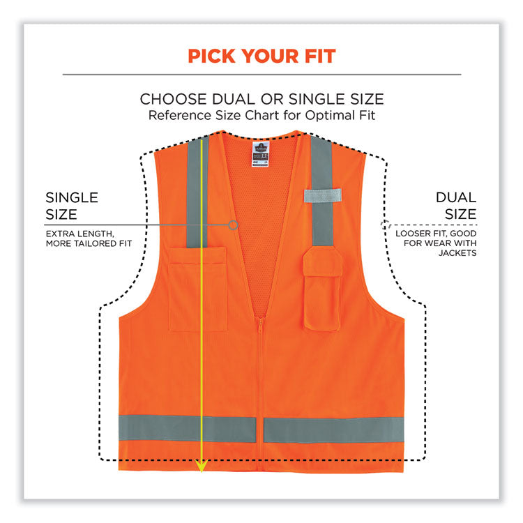 The GloWear 8249Z Surveyors Vest is an ANSI 107 Type R, Class 2 economy vest with a 3.6 oz polyester solid front and breathable 3.3 oz polyester mesh back. This hi-vis vest features 2" reflective tape for enhanced low-light visibility. With two interior and two exterior pockets, including a cell phone chest pocket, this vest provides ample storage for pens, notebooks, tablets and more. A single mic tab allows convenient radio access, and a zipper closure makes for easy on and off. Apparel Type: Safety Vest; Material(s): Polyester; Color(s): Orange; Color Family: Orange.