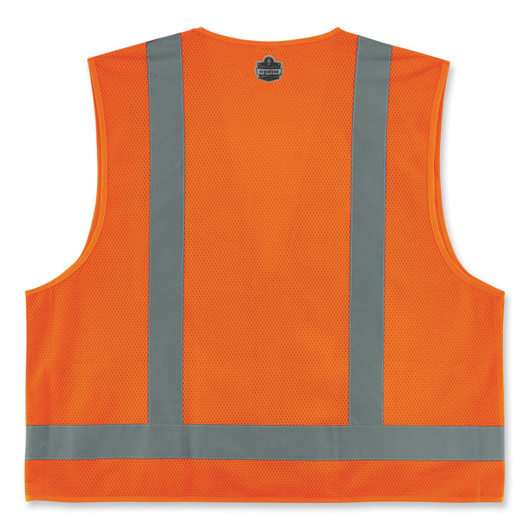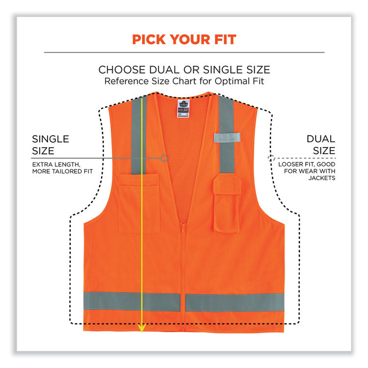 The GloWear 8249Z-S Hi-Vis Surveyors Vest is an ANSI 107 Type R, Class 2 vest with a 3.6 oz polyester solid front and breathable 3.3 oz polyester mesh back. This hi-vis vest features 2" reflective tape for enhanced low-light visibility. With two interior and two exterior pockets, including a cell phone chest pocket, this vest provides ample storage for pens, notebooks, tablets and more. A single mic tab allows convenient radio access, and a zipper closure makes for easy on and off. This vest is available in single sizes to allow workers to order their exact size for a more tailored, performance-style fit compared to dual-size vests (tip: for best fit, select one size down from your normal T-shirt size). This reflective safety vest is ideal for anyone requiring Type R, Class 2 apparel. Apparel Type: Safety Vest; Material(s): Polyester; Color(s): Orange; Color Family: Orange.