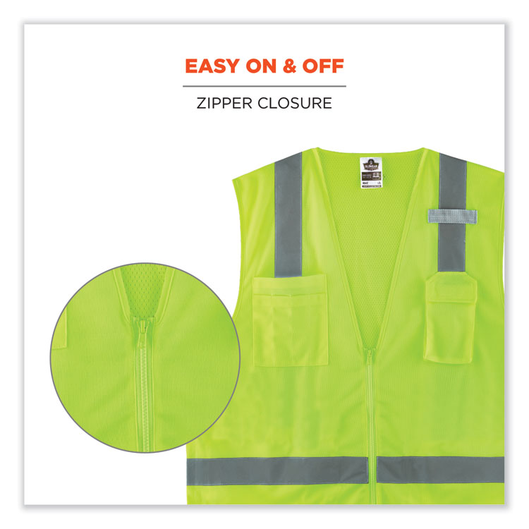 The GloWear 8249Z-S Hi-Vis Surveyors Vest is an ANSI 107 Type R, Class 2 vest with a 3.6 oz polyester solid front and breathable 3.3 oz polyester mesh back. This hi-vis vest features 2" reflective tape for enhanced low-light visibility. With two interior and two exterior pockets, including a cell phone chest pocket, this vest provides ample storage for pens, notebooks, tablets and more. A single mic tab allows convenient radio access, and a zipper closure makes for easy on and off. This vest is available in single sizes to allow workers to order their exact size for a more tailored, performance-style fit compared to dual-size vests (tip: for best fit, select one size down from your normal T-shirt size). This reflective safety vest is ideal for anyone requiring Type R, Class 2 apparel. Apparel Type: Safety Vest; Material(s): Polyester; Color(s): Lime; Color Family: Green.