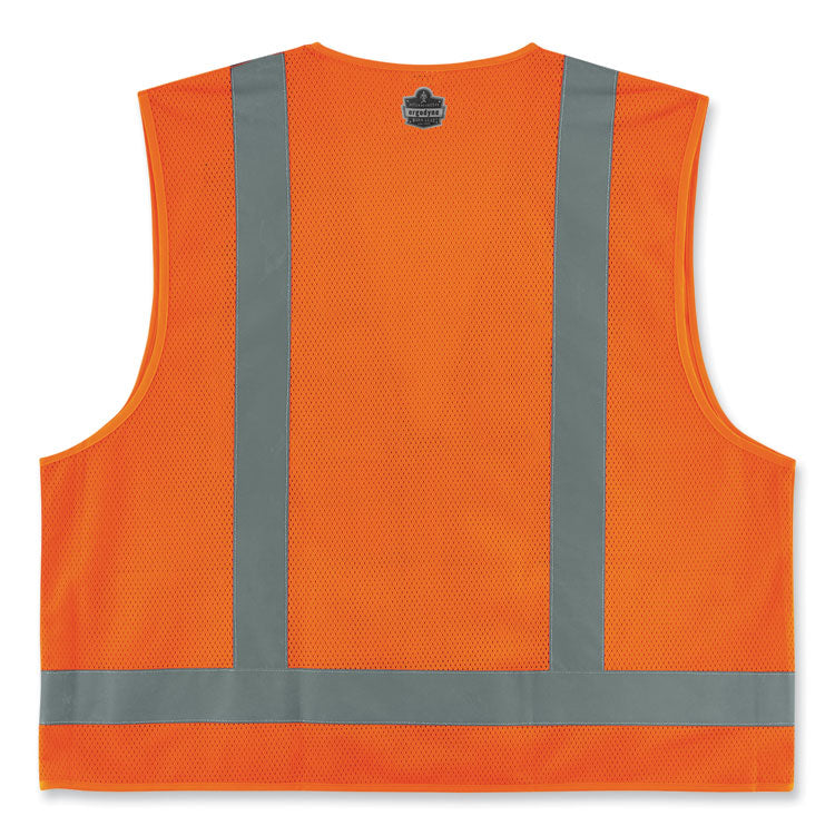 The GloWear 8249Z-S Hi-Vis Surveyors Vest is an ANSI 107 Type R, Class 2 vest with a 3.6 oz polyester solid front and breathable 3.3 oz polyester mesh back. This hi-vis vest features 2" reflective tape for enhanced low-light visibility. With two interior and two exterior pockets, including a cell phone chest pocket, this vest provides ample storage for pens, notebooks, tablets and more. A single mic tab allows convenient radio access, and a zipper closure makes for easy on and off. This vest is available in single sizes to allow workers to order their exact size for a more tailored, performance-style fit compared to dual-size vests (tip: for best fit, select one size down from your normal T-shirt size). This reflective safety vest is ideal for anyone requiring Type R, Class 2 apparel. Apparel Type: Safety Vest; Material(s): Polyester; Color(s): Orange; Color Family: Orange.