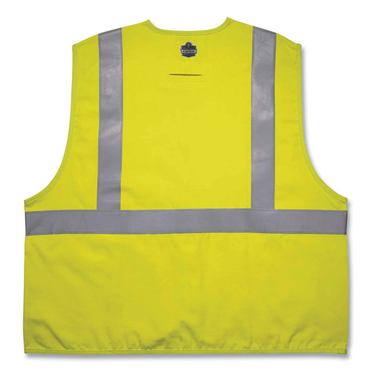 The GloWear 8261FRHL Hi-Vis FR Class 2 Safety Vest is dual FR-compliant to NFPA 2112 and NFPA 70E for protection against flash fire and arc flash hazards. Designed to be worn as part of a complete FR garment system, it is tested and certified to an ATPV 6.6 cal/cm2. Flame-resistant safety vest is made with breathable, moisture-wicking and ANSI-compliant 5.5 oz Westex by Milliken DH material for full protection from flash fire and arc flash. Reflective vest is a Type R Class 2 garment and features 2 3M Scotchlite FR reflective for heightened visibility at night or in low light environments. Features two convenient interior pockets, one open top to fit cell phones, badges, and more and one dual pen pocket. A single flame-resistant radio mic tab and flame-resistant hook and loop front closure designed for easy on/off. This FR high-visibility clothing is ideal PPE for petrochemical, electrical, oil and gas and refinery work. Apparel Type: Safety Vest; Material(s): Tencel; Modacrylic; Para-aramid; Color(s): Lime; Color Family: Green.