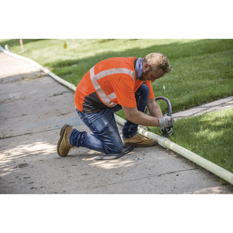 Class 2 black front performance T-shirt made of lightweight birdseye knit paired with 3M Scotchlite Comfort Trim. Moisture wicking treatment and armpit vents keep the user cool and dry. 30+ UPF for protection against harmful UV. An outside chest pocket to keep small items accessible. Black front and collar hide dirt and wear. Apparel Type: Hi-Vis Shirt; Material(s): Polyester; Color(s): Orange; Color Family: Orange.