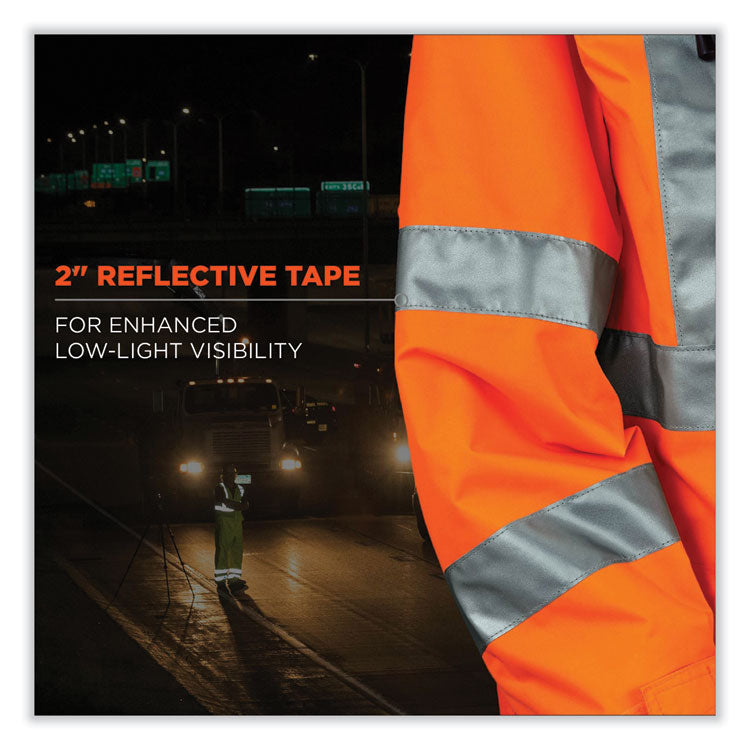 The GloWear 8365 Hi-Vis Rain Jacket is a Type R, Class 3 jacket that offers waterproof, breathable protection against the elements. Made with a breathable polyester shell that keeps water out while letting moisture escape to keep you cool and comfortable working in the worst conditions. This reflective rain jacket has 2 ANSI compliant 3M Scotchlite Reflective material on the chest and arms for added visibility at night or in low-light conditions. The inset hood can be tucked away when not needed. This waterproof work jacket offers comfortable protection against the elements for those working in road construction, utilities, construction, emergency response, airline, railway or survey crews. Apparel Type: Raincoat; Material(s): Polyester; Color(s): Orange; Color Family: Orange.