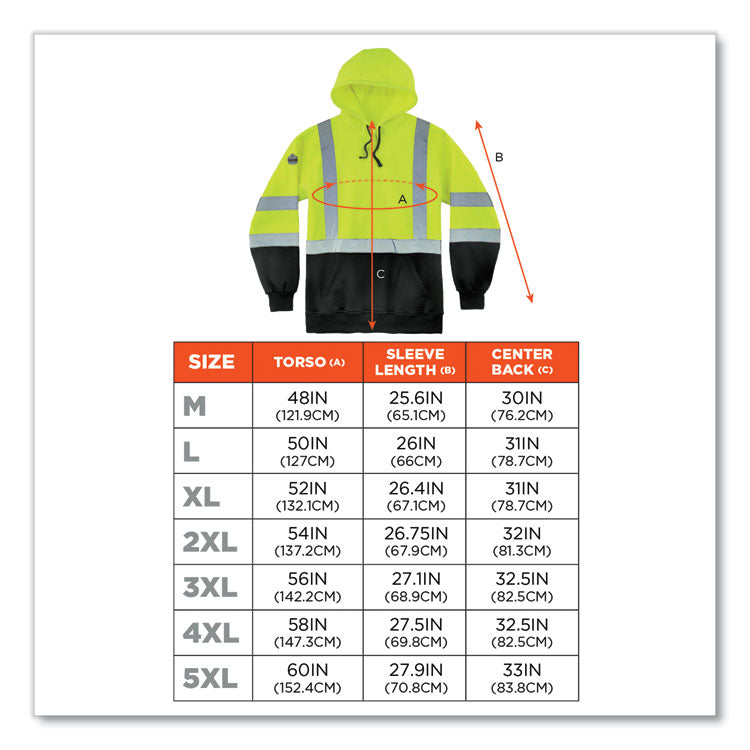 The GloWear 8373 Hi-Vis Pullover Hoodie with Black Bottom meets ANSI/ISEA 107-2015 Type R, Class 3 Standards for safety and is designed with high-quality 100% polyester polar fleece to provide conspicuity and warmth during chilly days. This safety sweatshirt has a pouch-style pocket great for additional hand warmth and storage. The bottom front and wrist sections of the sweatshirt are black to prevent a dirty look where it matters most. The contrasting high visibility yellow/lime color provides ultimate visibility. There is 2 ANSI-compliant silver reflective tape on the torso, shoulders and sleeves making it a great reflective hoodie to wear as night falls for effective visibility. The drawstring hood and elastic knit waistband and cuffs keep the heat in for all-day warmth throughout the workday. It is perfect for jobsites in high-traffic areas like road construction or anywhere that requires high visibility clothing. Apparel Type: Hi-Vis Shirt; Material(s): Polar Fleece; Color(s): Lime; Color Family: Green.