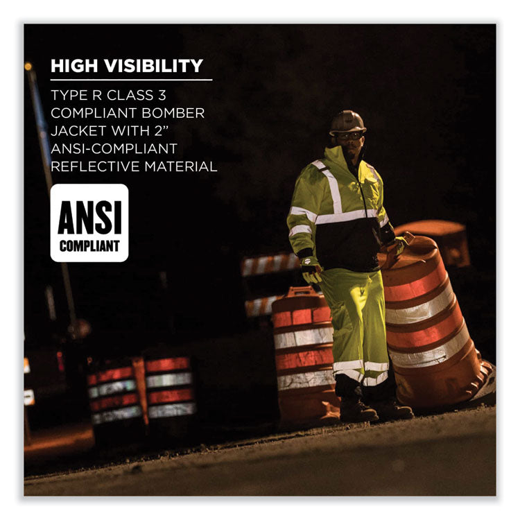 The GloWear 8377 Type R Class 3 Quilted Thermal High Visibility Jacket polyester outer shell with PU coating resists water and wind for warm and dry comfort all day. The black panels hide dirt and wear. Cuffs feature hook and loop straps to seal out the cold. Featuring two external front pockets for stashing gloves, phones and other gear plus an upper chest cell phone pocket. There are two mic tabs located on the upper chest of the jacket. This reflective coat is a Type R Class 3 garment and features 2" ANSI-compliant reflective stripes for nighttime visibility. Type R Class 3 garments feature more fluorescent background material and retroreflective material than other classes, to ensure maximum visibility and safety in all conditions. Apparel Type: Hi-Vis Jacket; Material(s): Polyester; Color(s): Orange; Color Family: Orange.