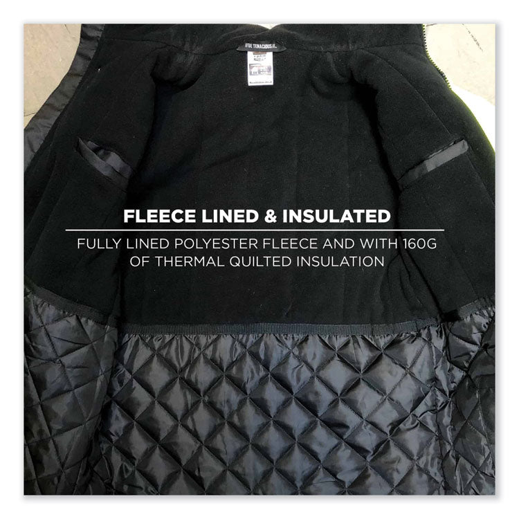 The GloWear 8384 Type R Class 3 Thermal Quilted High Visibility Jacket is the ideal warm winter work jacket for safety on the job. This Type R high visibility jacket has an insulated interior with fleece for warmth in frigid conditions. This winter workwear features 160 g thermal insulation plus fleece, which traps body heat to keep you warmer in the cold. The 300D oxford polyester outer shell with PU coating resists water and wind, for dry comfort all day. The black panels hide dirt and wear. Cuffs feature hook and loop straps to seal out the cold. Features external front pockets with snap flaps, combination cell phone chest pocket, dual-slot pen pocket on arm, and dual-mic tabs for clipping radios. This safety high-visibility jacket is rated Type R Class 3 for increased visibility and features 2 ANSI-compliant reflective stripes for nighttime visibility. Apparel Type: Hi-Vis Jacket; Material(s): Polyester; Color(s): Orange; Color Family: Orange.