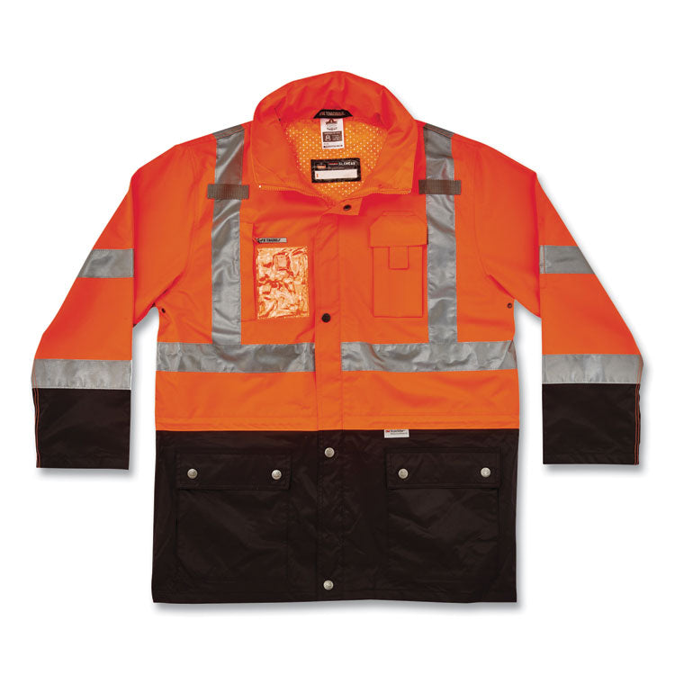 Class 3 outer shell jacket made of breathable poly keeps the rain out while letting perspiration escape. Black panels hide dirt in high wear areas. Fits over 8287 inner jacket to create a thermal 4-in-1 jacket. 2 ANSI-compliant 3M Scotchlite Reflective for visibility. Inset hood with drawstring and stoppers. A total of four pockets and a clear ID holder to keep personal items secure. Dual mic tabs for clipping radios. Apparel Type: Hi-Vis Jacket; Material(s): Polyester; Color(s): Orange; Color Family: Orange.