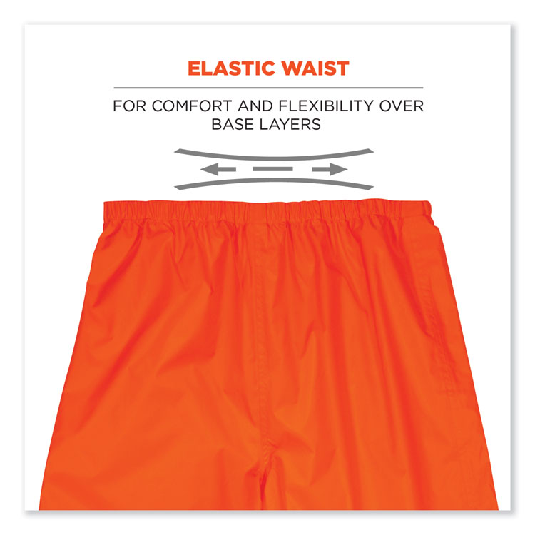The GloWear 8916 Lightweight hi-vis rain pants offer protection against wet conditions while ensuring safety. A comfortable elastic waistband means these waterproof work pants can be worn alone or over a base layer, while the pant legs have snap cuffs to easily fit over boots and tightened to keep the wind out. These work rain pants are built for demanding conditions with rugged yet lightweight waterproof materials (150D polyester oxford material with a PU coating) and fully taped seams. The ANSI/ISEA 107 compliant high visibility polyester fabric and 2 reflective tape keeps workers highly visible at night or in low light conditions. These hi-vis waterproof pants meet ANSI 107 Supplemental Class E Standards. Made for the industrial workplace and workers in low-light environments, flagging crews, utility crews, road construction, railway workers and any others working in the rain. Apparel Type: Rain Pants; Material(s): Polyester; Color(s): Orange; Color Family: Orange.