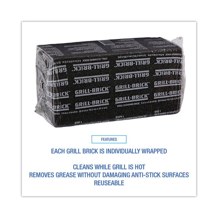 Solid, heat-resistant brick may be used while your grill is still hot, allowing you to clean up immediately after cooking so it's ready for next time. The gentle yet abrasive scrubber effectively removes grease and residue without causing damage to anti-stick, grill, or griddle surface coatings. Reusable, stone-like, abrasive brick slowly wears down with use, exposing a fresh surface for each use. Scouring Pads/Sticks Type: Brick; Material(s): Stone-Like; Size (W x L): 8" x 4"; Color(s): Black.