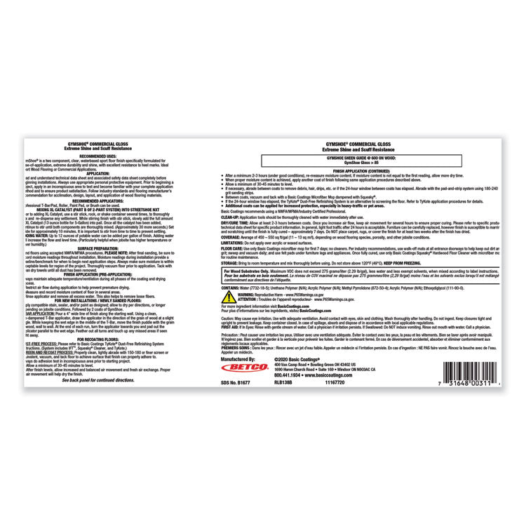GymShoe® is an exceptionally durable sport floor finish that keeps floors looking better longer. Enjoy enhanced traction as slip-resistance meets or exceeds the minimum requirements. This clear, water-based finish allows for easy clean-up. It is perfect for large sport complexes, higher education, dance floors, retail and commercial space, or any high-traffic sports facilities. With superior two-component performance you can be confident that GymShoe® will hold up to even the busiest of gyms. Application: Floor Finish; Applicable Material: Wood; Chemical Compound: Acrylic Polymer; Urethane Polymer; Scent: Mild.