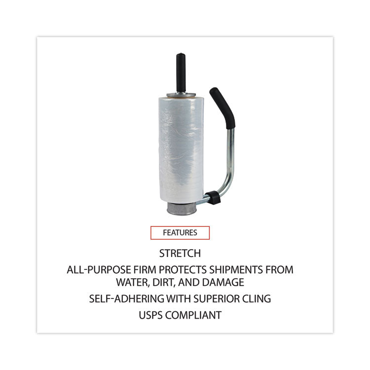 All-purpose hand film protects shipments from water, dirt, and damage caused by excess movement and poor package handling. The film provides exceptional toughness and superior cling when wrapped around shipping content. Constructed from a self-adhering material, each layer of film clings to the next for added strength. Rolls feature a 3" core. Use with Universal® Adjustable Hand Dispensers (sold separately) for easy application. Unstretched-Standard unstretched film for heavier loads: up to 2,000 lbs. Self-Adhering: Yes; Width: 12"; Pallet Type: B and C; Thickness/Gauge: 20 Micron/80-Gauge.