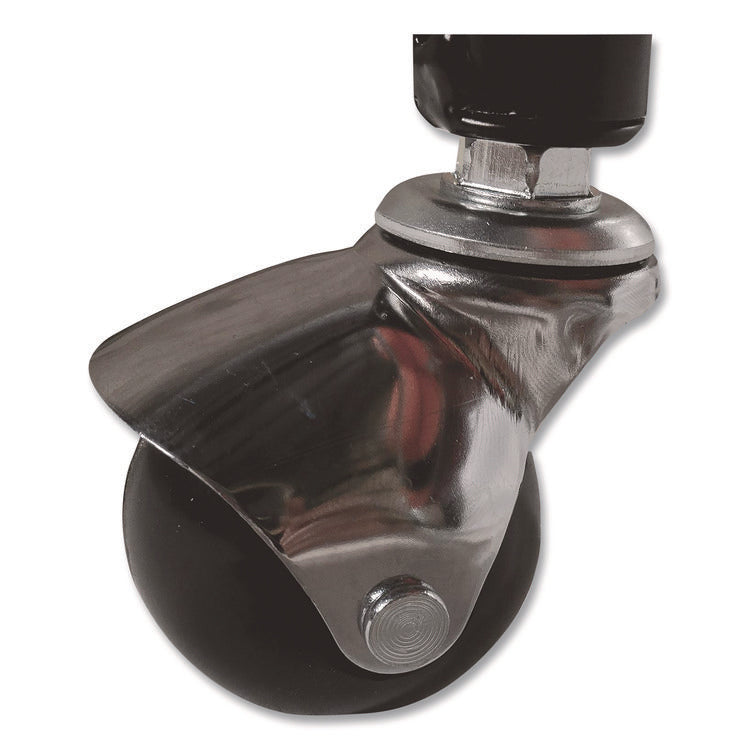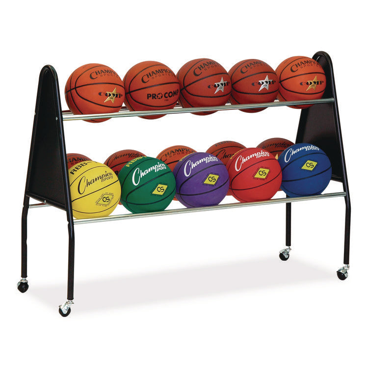 The Champion Sports 15-ball cart keeps all basketballs or playing balls neatly organized. The cart was designed to keep sporting balls within a player's reach and easily accessible. The heavy-duty chrome steel and solid triangular end frames allow for extra strength and stability. The wide base prevents tipping, and this cart easily rolls in and out of storage with its non-marring casters that protect the finish of your playing surface. Material(s): Steel; Overall Material Type: Metal; Color(s): Black; Color Family: Black.