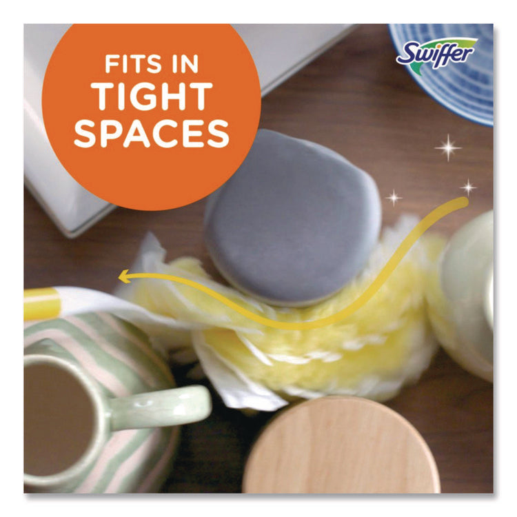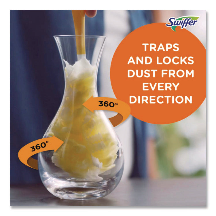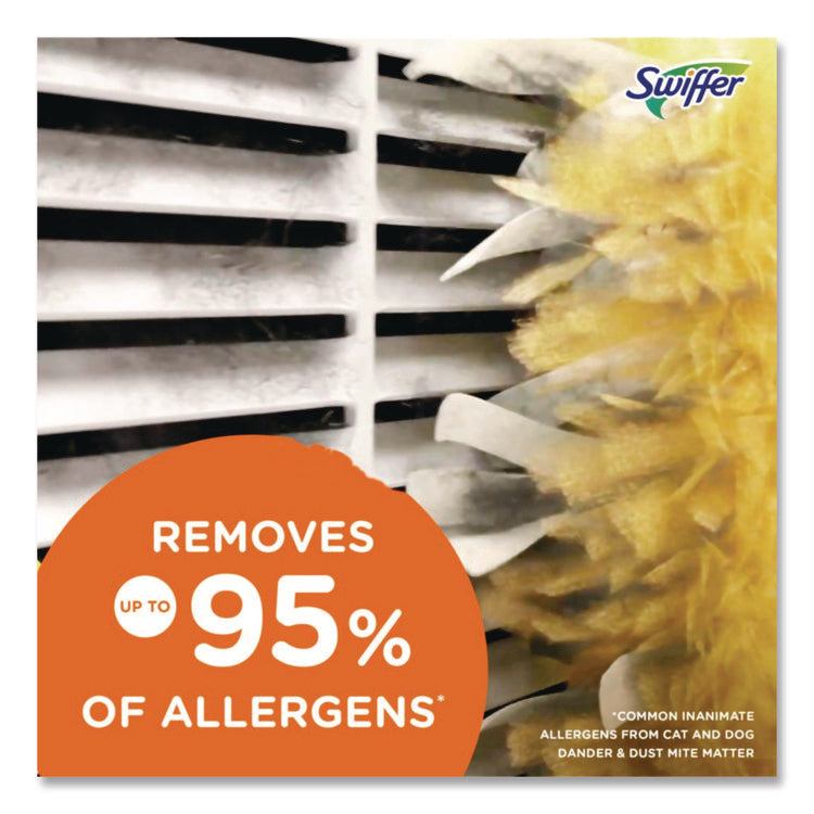 All-around design maximizes surface area to reach tight corners and smaller spaces. Traps and locks up to 3x more dust than a feather duster. Ideal for cleaning wood furniture, electronics, plants and more. For use with Swiffer Heavy Duty Dusters Handle (sold separately). Unscented. Bristle Material: Dust Lock™ Fiber; Bristle Length: 6"; Bristle Depth: 2"; Bristle Color: Yellow.