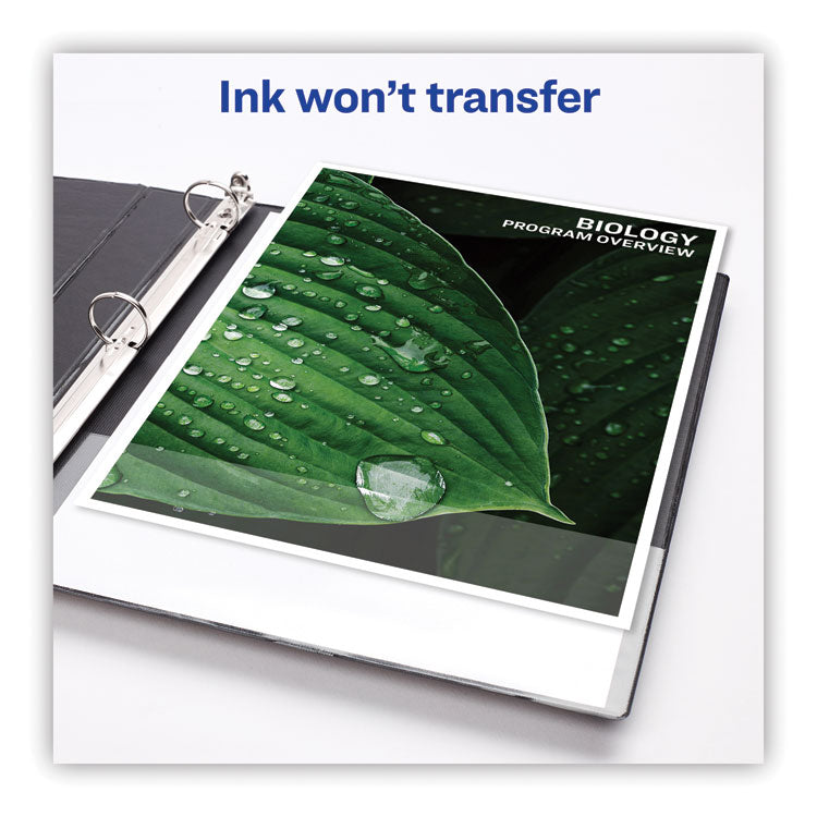 With this Heavy-Duty Nonstick View Binder you get one-touch operation and the durability required for everyday use. Nonstick material won't lift ink or toner off printed pages. Tear-resistant DuraHinge® design is stronger and lasts longer. DuraEdge® feature makes the sides and top more pliable, providing greater split resistance. Deeply textured film offers a smoother finish and features a linen pattern for a high-quality look and feel. Four clear, interior pockets provide extra storage space. Wider front and back panels fully cover standard dividers and sheet protectors. Slant rings have a higher page capacity when compared to the same size round rings. Pages lie flat with back-mounted rings (exposed rivets on back). Customize your title page using free templates and designs at Avery® Design & Print Online. Slant Rings-Holds more sheets than the same size round rings. Binder Type: Ring; Binder Style: View; Binder Size Capacity: 1"; Binder Sheet Capacity: 250.