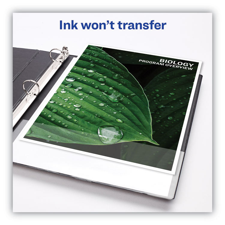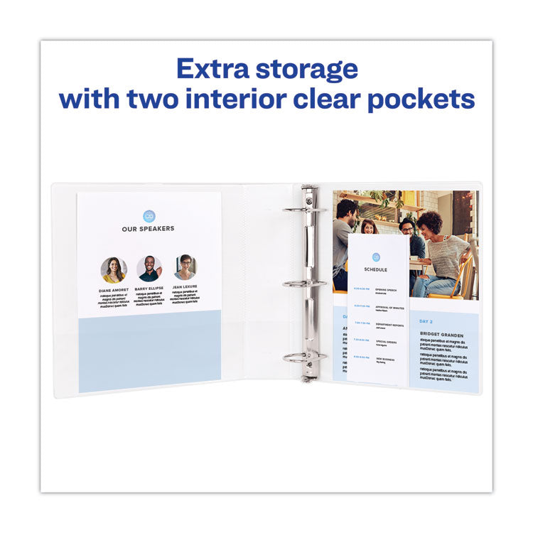With this Heavy-Duty Nonstick View Binder you get one-touch operation and the durability required for everyday use. Nonstick material won't lift ink or toner off printed pages. Tear-resistant DuraHinge® design is stronger and lasts longer. DuraEdge® feature makes the sides and top more pliable, providing greater split resistance. Deeply textured film offers a smoother finish and features a linen pattern for a high-quality look and feel. Four clear, interior pockets provide extra storage space. Wider front and back panels fully cover standard dividers and sheet protectors. Slant rings have a higher page capacity when compared to the same size round rings. Pages lie flat with back-mounted rings (exposed rivets on back). Customize your title page using free templates and designs at Avery® Design & Print Online. Slant Rings-Holds more sheets than the same size round rings. Binder Type: Ring; Binder Style: View; Binder Size Capacity: 2"; Binder Sheet Capacity: 540.