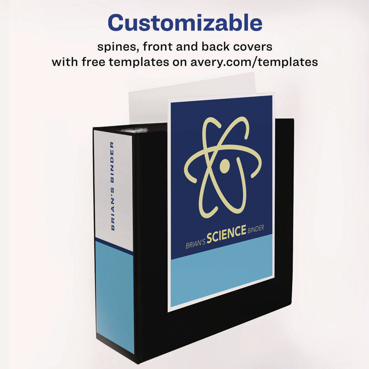 Heavy-Duty view binder with one touch EZD rings is perfect for long-term, regular use. Tear-resistant DuraHinge design is stronger and lasts longer. DuraEdge feature makes the sides and top more pliable, providing greater split resistance. Deep-textured film offers a smoother finish and features a linen pattern for a high-quality look and feel. Clear cover and spine for easy customization. Four clear, interior pockets provide extra storage space. Wider front and back panels fully cover standard dividers and sheet protectors. One touch EZD rings provide easy access and have a higher page capacity when compared to the same size round rings. Customize the cover with free, easy-to-use templates and designs at Avery Design & Print online. Binder Type: Ring; Binder Style: View; Binder Size Capacity: 4"; Binder Sheet Capacity: 780.