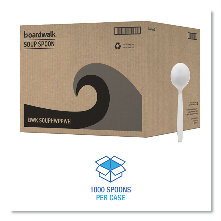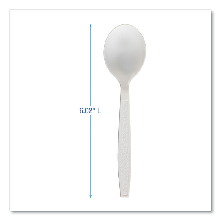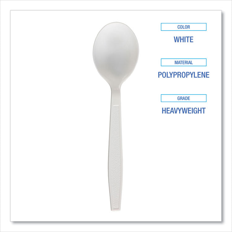 A great option for virtually any dining environment, heavyweight, polypropylene cutlery items offer quick event set-up, packing for to-go meals, and a variety of other every day uses. Carton quantities that are easy to stock and distribute to diners. The utensils have the strength and versatility to be used with most cuisines, making them an ideal fit for takeout, concession stands, cafeterias, offices, events, and outdoor gatherings. Utensils Type: Soup Spoon; Material Type: Plastic; Material(s): Polypropylene; Color(s): White.