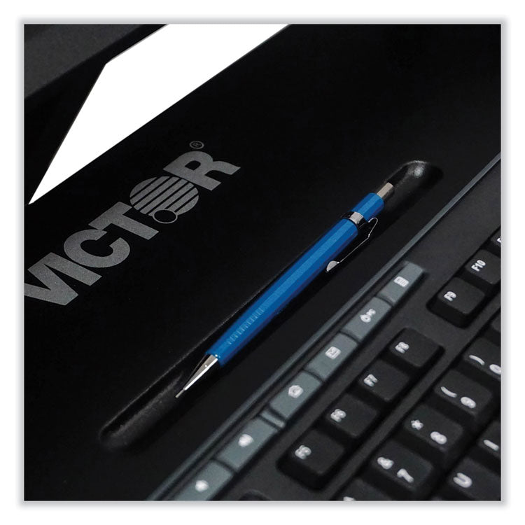 Transform any sit-down desk into a standing desk. Easily adjustable to your preferred height, this corner model ensures the correct ergonomic placement of monitors, keyboard, mouse, and other accessories for optimal comfort. Sleek and sturdy wood construction with a durable laminate coating provides years of use. Series Name: Victor® High Rise™ Collection; Worksurface/Base Color: Black; Color Family: Black; Worksurface Shape: Rectanglular with Rear Tapered Corners.