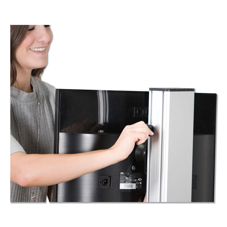 Transforms any sit-down desk into a sitting or stand-up desk. The 28" wide by 23" deep surface is raised up to 20" for ergonomic placement of monitor, keyboard, mouse, telephone and papers while standing. Electric motor design allows easy custom height adjustment with the push of a button. The monitor holder is also height-adjustable with a range of 12.5". Safety sensor stops movement when obstacles are detected under the desk. Sleek wood construction and a durable laminate coating provides years of use with a modern style. The sturdy steel base and aluminum tower are built to last. This standing desk converter rests on top of any desk or table. Holds one monitor of any size up to 25 pounds. Standard VESA mounting holes are required. Series Name: Victor® DC400 High Rise™ Collection; Worksurface/Base Color: Black/Aluminum; Color Family: Black; Worksurface Shape: Rectangular.
