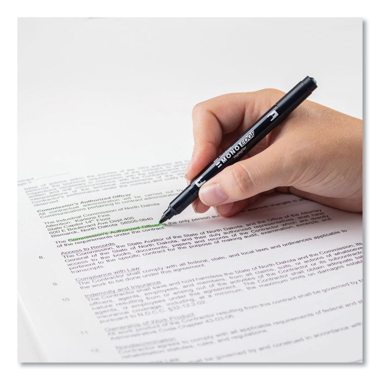 Dual-tip highlighter with durable broad chisel tip and extra-fine bullet tip in one pen. Resin-coated tips and polymer-coated core prevent tip breakage or staining rulers, eliminating unwanted ink transfer. Protective plastic sleeve on chisel tip maintains shape even when using with metal rulers or stencils. Vibrant, fluorescent colors are perfect for color-coding and calling attention to important text. Fine tip works great for underlining and writing margin notes. Fast-drying odorless ink doesn't smear and won't bleed through most papers. Color-coded cap features durable clip. Highlighter Style: Pen; Highlighter Ink Color: Yellow Green; Color Family: Green; Highlighter Tip Type: Chisel/Bullet.