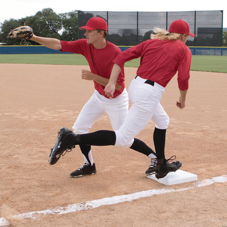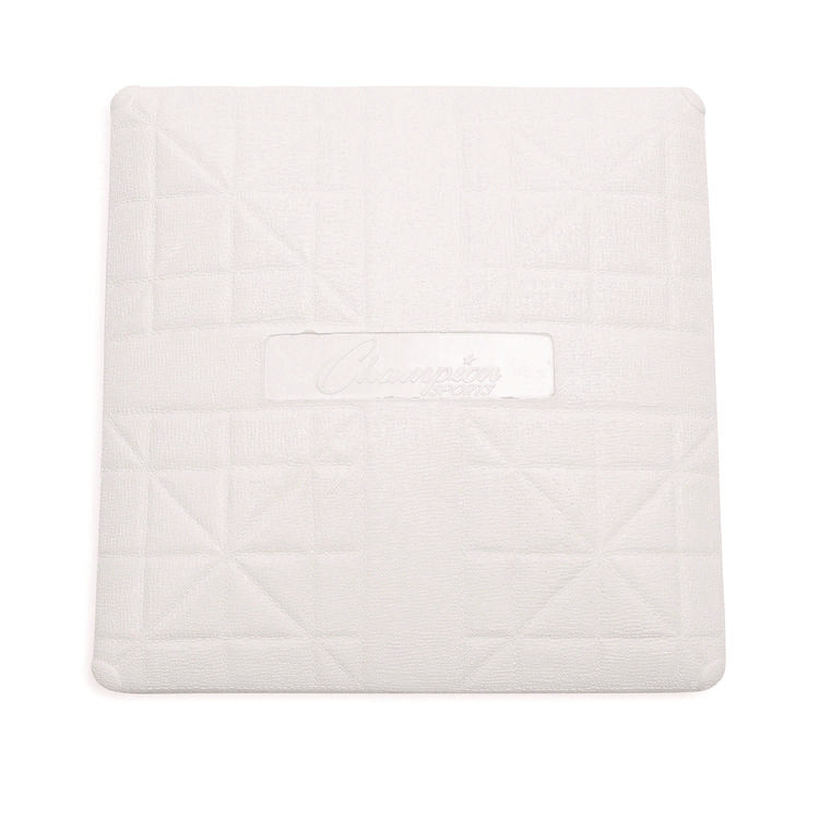 Made for intense play on the baseball diamond, the Champion Sports Pro Anchored Base Set is sure to hold up to the wear and tear that comes from baseball games in any league. With a heavy rubber cover and rust-proof bolted stanchion pan, this base set will stand up to rain, mud, and snow, as well as players' cleats. High-density foam is soft enough to avoid injury for players sliding into bases. The hinged ground anchors make it easy to remove and transport. Length: 15"; Width: 15"; Material(s): Foam; Rubber; Playground/Gymnasium Sets Type: Base Set.