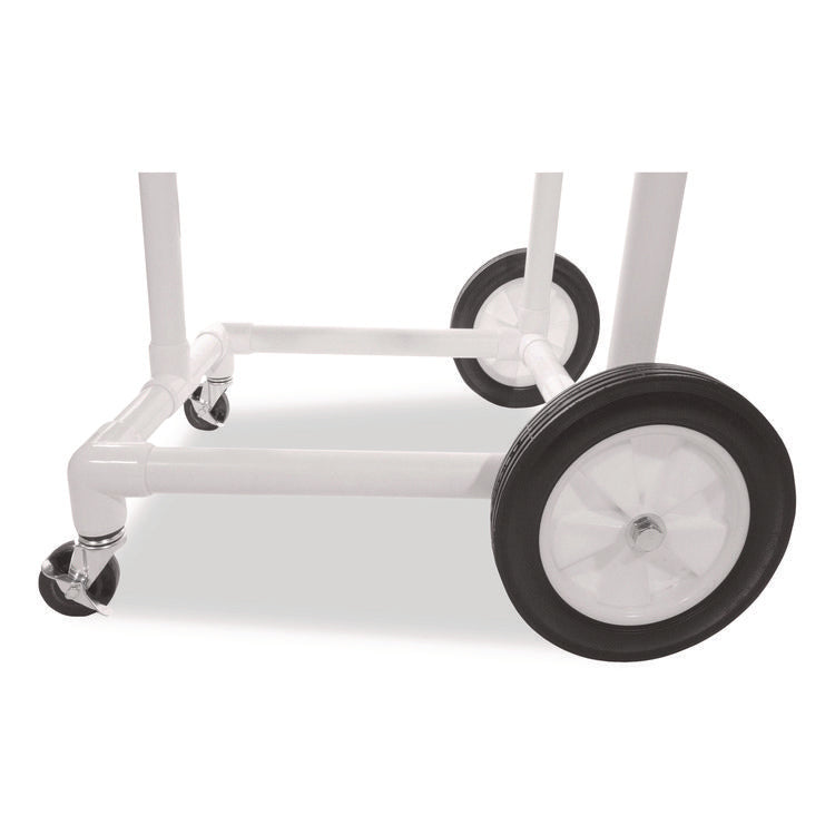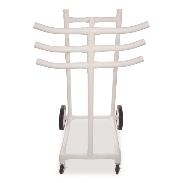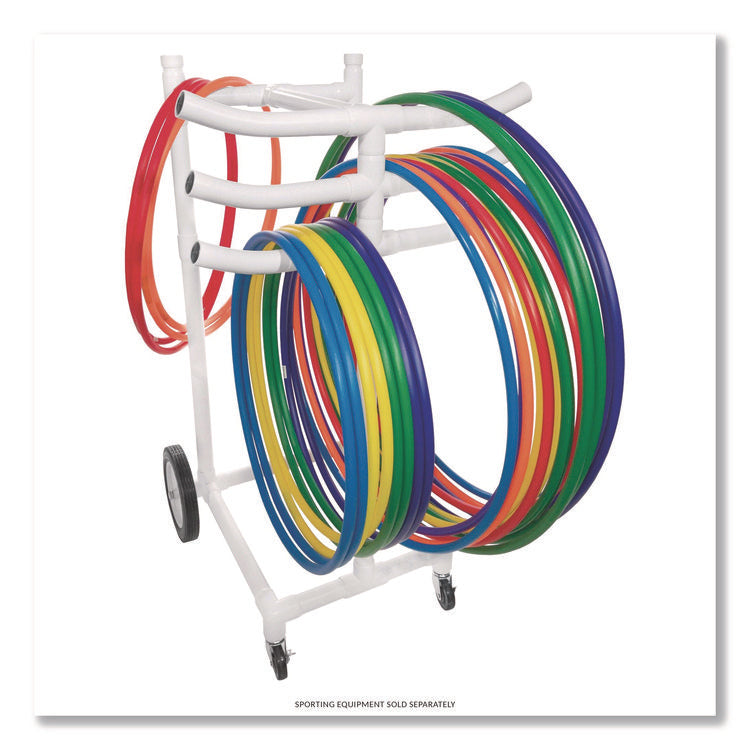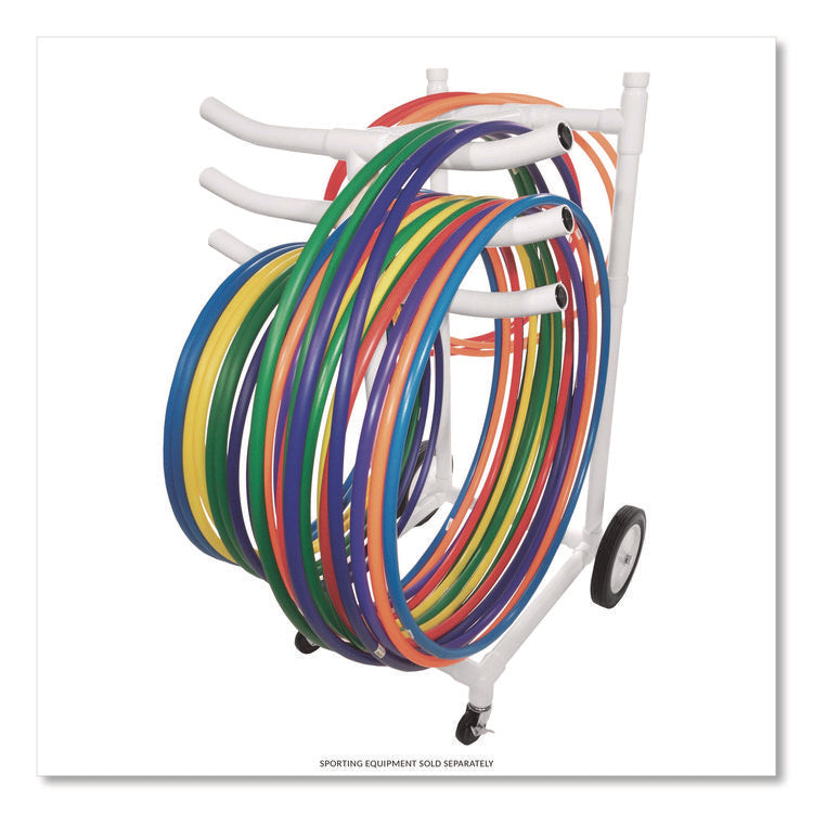 Keep your plastic hoops organized with the Champion Sports Hoop Storage Cart. This handy cart holds hoops of various sizes and is a must for any P.E. or recreational equipment closet! Made of heavy-duty plastic, this cart can hold up to 100 hoops on multi-level hooks and features front swivel casters with durable large rear wheels. Material(s): Plastic; Overall Material Type: Plastic; Color(s): White; Color Family: White.