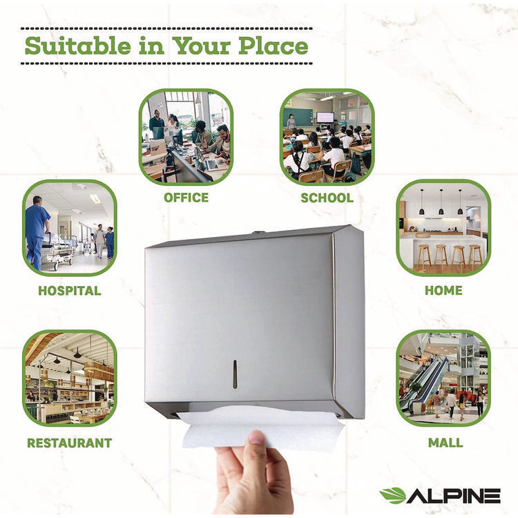 The Alpine Industries C-Fold/Multi-Fold paper towel dispenser is ideal for high traffic restrooms, break rooms, food service facilities, health-care facilities and more. Made of durable stainless steel with a brushed finish and features a lock to help prevent tampering and vandalism. The dispenser features a sight window on the front to monitor fill levels. The paper towel dispenser can easily be mounted to any wall or surface. A slanted top adds style, while preventing it from being used as a shelf and ensuring long-term use. Towels Dispensers Type: Folded Towel Dispenser; Dispenser Capacity (text): 290 C-Fold; 380 Multi-Fold; Material(s): Stainless Steel; Color(s): Brushed Nickel.