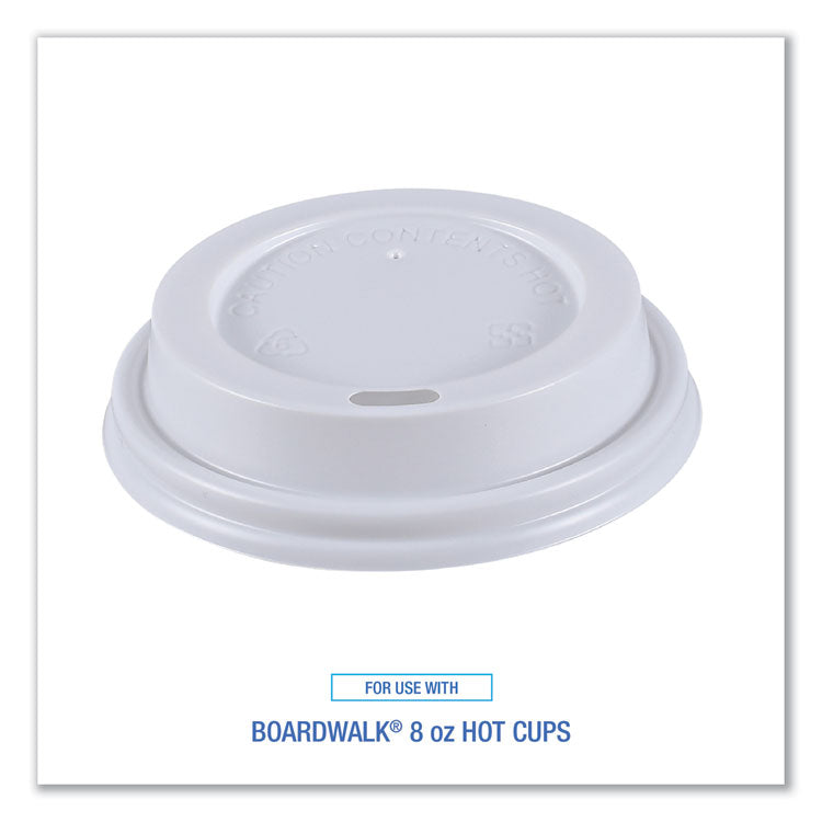 Sturdy hot cup lids lock tightly to prevent spills on the go. Designed to fit Boardwalk® Convenience Pack Paper Hot Cups, as well as other Boardwalk® Paper Hot Cups. Fits snugly around the rim of the Boardwalk® cups to ensure hot drinks stay inside until they are ready to be sipped. Packed with wrapped sleeves for sanitation and easy transport from the stock room to the beverage counter or preparation area. Fits: 8 oz Hot Cups; Material Type: Plastic; Material(s): Polystyrene; Color(s): White.