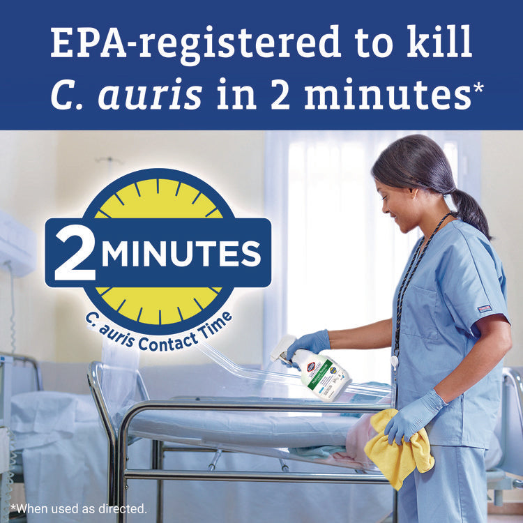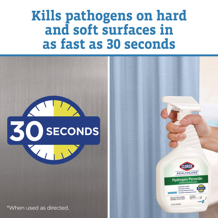 Better surface compatibility, less residue. Clorox Healthcare Hydrogen Peroxide Cleaner Disinfectants are made with no added fragrances or harsh odors and are EPA registered to kill over 40 microorganisms in 1 minute or less, including SARS Co V2 in 30 seconds on hard nonporous surfaces when used as directed. Worry less with noncorrosive disinfectants tested on medical devices and save time with fast non bleach disinfectants. Clorox Healthcare hydrogen peroxide disinfectant is a bleach-free sanitizer that is EPA registered to kill bacteria on soft surfaces in 30 seconds. Use in hospitals, operating rooms, outpatient surgery centers, emergency rooms, dental offices, veterinary offices and long term care facilities. Use as directed, refer to the EPA master label for a complete list of organisms and contact times. Application: Disinfectant/Cleaner; Applicable Material: Acrylic; Ceramics; Enamel; Fiberglass; Finished/Sealed Wood; Laminates; Metal; Plastic; Sealed/Engineered Stone; Vinyl; Chemical Compound: Hydrogen Peroxide; Dirt Types: Bacteria; Dust; Fungus; Germs; Grime; Mildew; Mold; Organic Matter; Viruses; Water-Based Soil.