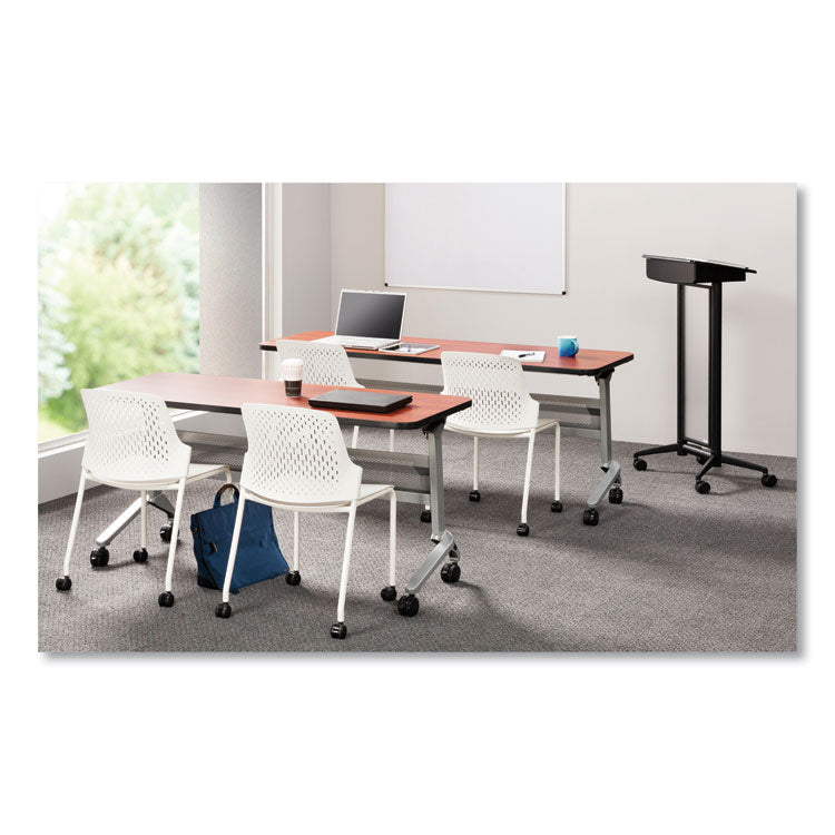 The Impromptu Lectern is a workspace podium built from a steel frame and translucent polycarbonate panel. The presentation stand is mobile on four swivel wheels (two locking). Complements entire Impromptu line of products. Color(s): Black; Color Family: Black; Caster/Glide/Wheel: Four 2.5" Swivel Casters (2 Locking); Overall Width: 26.5".