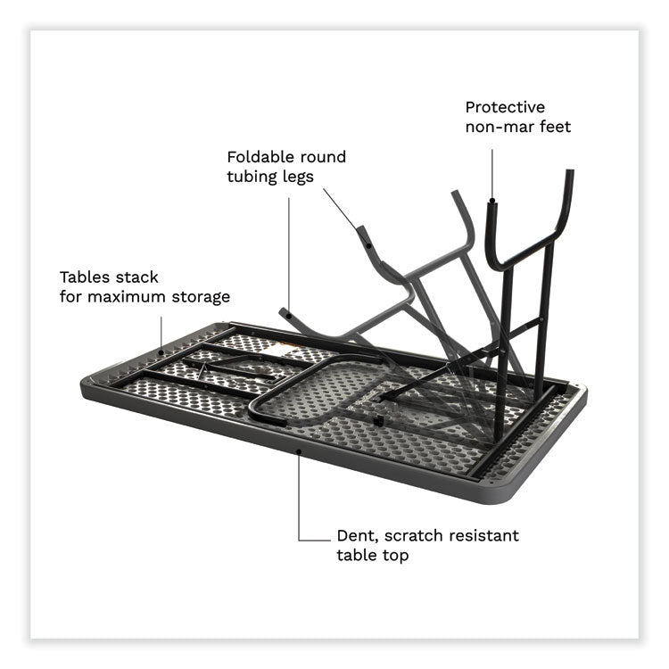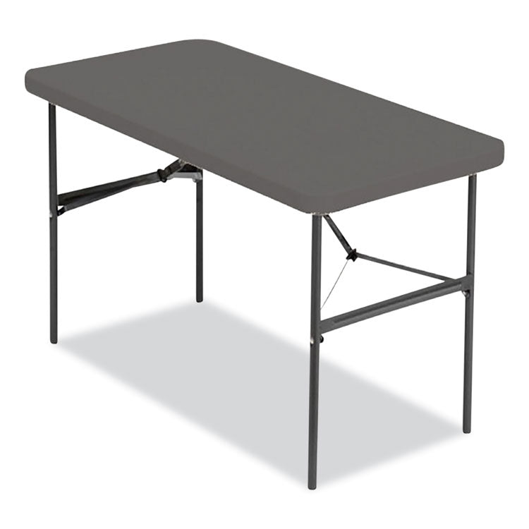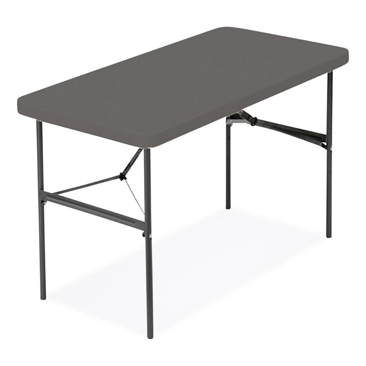 Contemporary in appearance and design, IndestrucTable® Commercial Folding Tables are designed for use indoors and out. Easy to set up, take down and transport, these lightweight tables are ideal for foodservice, school and office environments as well as at weddings, banquets and any number of special events. Dent- and scratch-resistant as well as surprisingly easy to clean, the blow-molded high-density polyethylene top features a square edge, so tablecloths can hang straight, ensuring a neat and tidy table-service appearance. Sturdy, powder-coated steel-tubing legs and an all-steel base provide a solid foundation to support anything from heavy merchandise displays to a full holiday feast. Convenient recessed channels for the legs allow the table to fold nearly flat for easy, compact storage. Rubber glides affixed to each leg help protect the finish on hard flooring. Top Color: Charcoal; Color Family: Gray; Base Color: Charcoal; Top Shape: Rectangular.