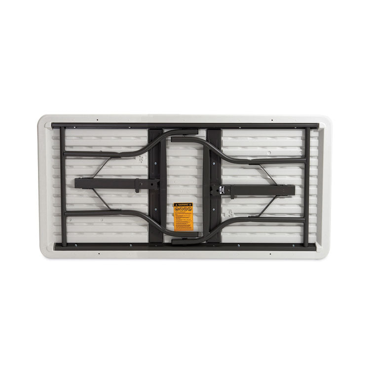Folding tables so multi-functional you'll wonder how you lived without them. Industrial-grade construction more than stands up to the tough demands that offices, schools, hotels and conference centers make. An attractive, contemporary design ensures they'll fit in wherever you place them. Dent- and scratch-resistant, easy-to-clean top is fabricated of blow-molded high-density polyethylene and features soft-beveled radius edges. Powder-coated, round metal-tube legs feature fold-out braces for extra strength and stability. Ideal for indoor and outdoor use. Tables nest together when stacked, with their legs folding into protective channels, to help you maximize your available storage space. Top Color: Platinum; Color Family: Gray; Top Shape: Rectangular; Overall Width: 96".
