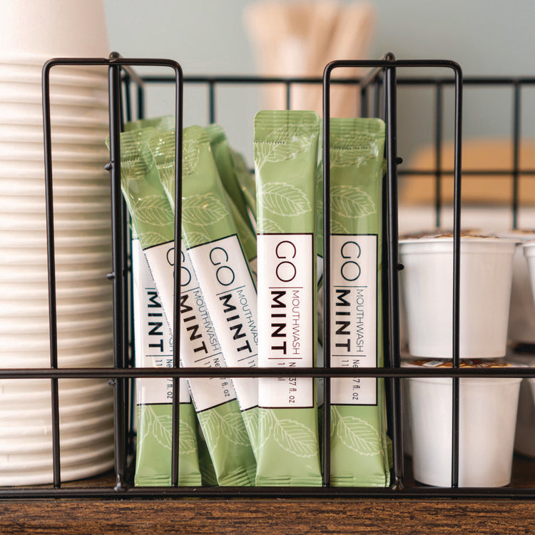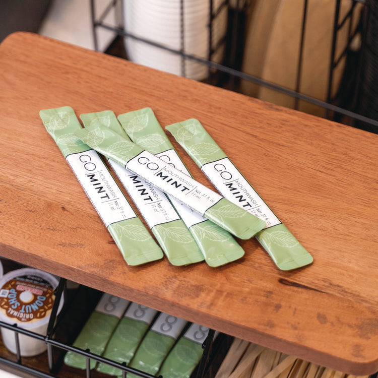 Cleanse your mouth and fight bad breath without any overpowering sensation with individually packaged mouthwash sachets which are alcohol free and contain no artificial dyes, no added colors and no harsh ingredients. Special formula containing Xylitol which inhibits the growth of bacteria and neutralizes acids that cause cavities. Take a set with you while traveling, TSA-approved and spill proof! Perfect portability for trips by plane, hotel stays, camping trips or business pursuits. Great for any time of day to freshen up your breath! Ideal for the breakroom, reception desk or by the cafe or snack stand! A convenient and luxurious solution for guests to freshen their breath and maintain oral hygiene. Display Pack—Includes 20 individual packets, neatly packaged in an easy to set up display. Volume Capacity: 0.37 oz; Flavor: Mint; Product Packaging: Packet; Quantity: 20/Pack.