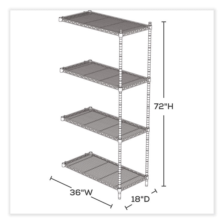 The Industrial Add-On Unit is an extra strength, welded wire construction storage shelf. The open wire shelves are perfect for office storage, promotes air circulation and reduces dust accumulation. The storage shelf is furnished with wire shelves that adjust in 1 increments, and includes four steel shelves, four posts and snap-together clips. Series Name: Safco® Industrial Wire Shelving; Shelf Type(s): Adjustable; Shelf Depth: 18"; Shelf Capacity (Weight): 1,250 lbs.