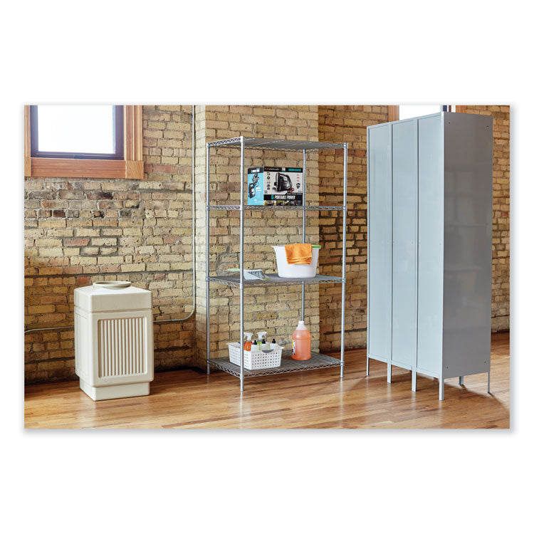 Welded wire construction for strength and durability. Open wire design permits air circulation and prevents dust accumulation. Shelves adjust in 1 increments, and the unit assembles in minutes without tools. Attractive, durable powder coat finish. Series Name: Safco® Industrial Wire Shelving; Number of Shelves: 4; Shelf Depth: 18"; Shelf Capacity (Weight): 1,250 lbs.