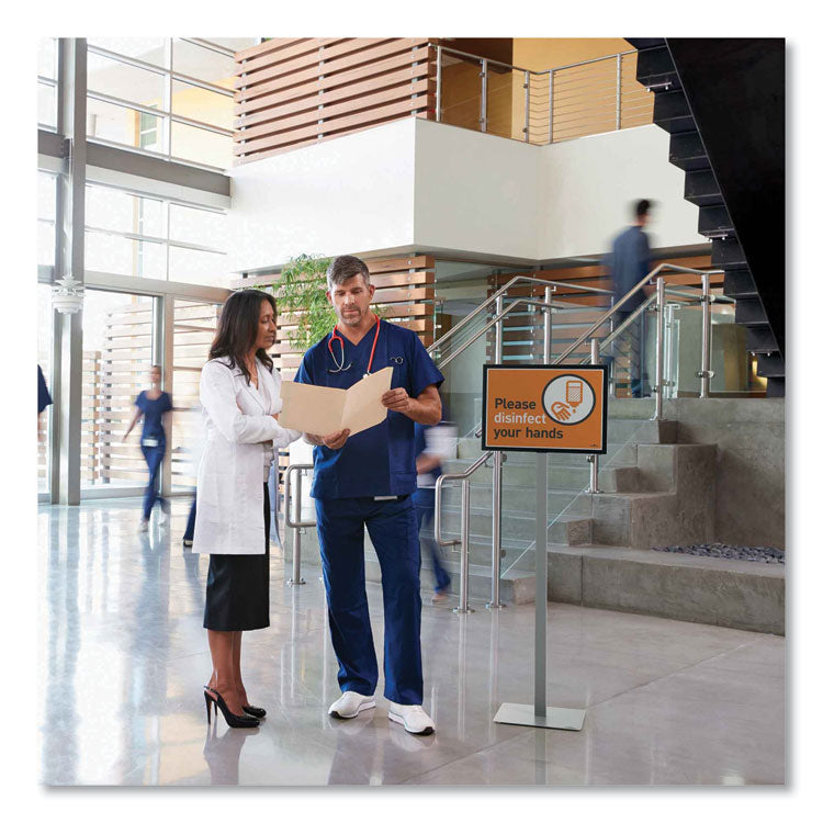 The Info Stand BASIC Tabloid-Size Floor Stand from DURABLE® is the go-to solution for effortless professional signage display. Easily showcase important information, instantly grabbing attention and effectively conveying your message right where you need it. Its sleek and professional appearance is perfect for directions, menu displays at host stands, guest information in lobbies and hotel entrances, valet and parking signage, safety alerts, restroom signage, and promotions. The double-sided visibility displays two messages simultaneously for maximum impact. Perfect for store entrances, conference centers, or any area where signage needs to be seen from both sides. Keep your messaging up to date with the innovative flip-up magnetic DURAFRAME frames. This unique design means you can update promotions, announcements, safety information, or directional signage without any hassle. Simply lift the frame, swap out your content, and secure it back in place with the magnetic closure. This keeps your signage fresh, relevant, and engaging for your employees and customers. The frame rotates 360° so you can display signage in either portrait or landscape orientation to best suit your display needs, offering flexibility and versatility for various signage applications. Constructed from aluminum, and a weighted base with non-slip pads, the stand offers maximum stability, preventing any potential tipping. Frame Color: Black; Size: 11 x 17; Message(s): Customizable; Insert Size: 11 x 17.