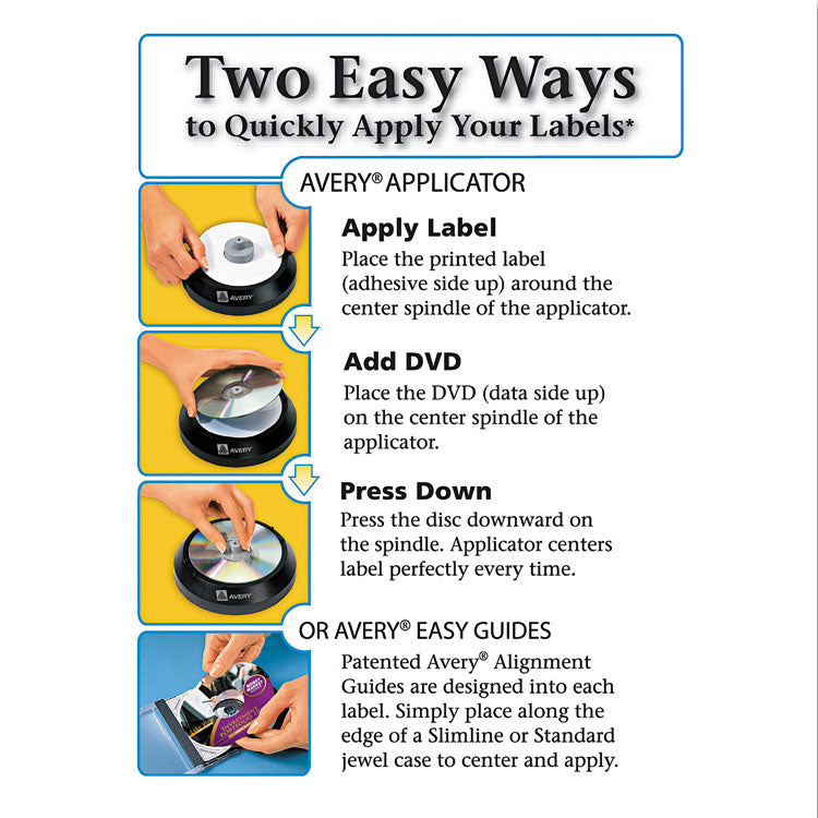 Labels are made of a special film material designed specifically for DVDs. Labels are guaranteed to not affect the playback of single-sided DVDs. Labels feature print-to-the-edge capability to add color to the edge of the label. Easy to customize with free designs and templates using Avery® Design & Print. 8.5" x 11" sheets. Label Type: Disc Labels; Media: DVD; Label Color(s): White; Material(s): Film.