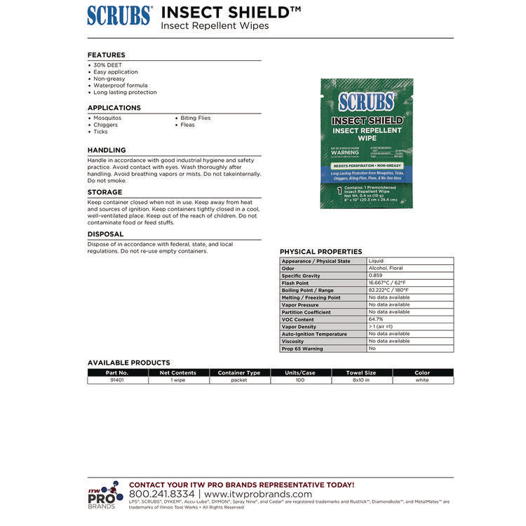 Convenient product provides the power of 30% DEET in a handy wipe. Insect repellant keeps disease-carrying insects at a distance; effective against mosquitoes, ticks, chiggers, flies, fleas and no-see-ums. Easy to apply, with no greasy feel. Water and sweat resistant wipes allow you to get on with your day. Individual wrapping protects wipe from contamination and evaporation, effectively maintaining consistency. 8 x 10 Wipes. Physical Form: Wipes; Application: Skin; Pest Type: Chiggers; Flies; Flying Insects; Gnats; Mosquitoes; Product Packaging: Packet.