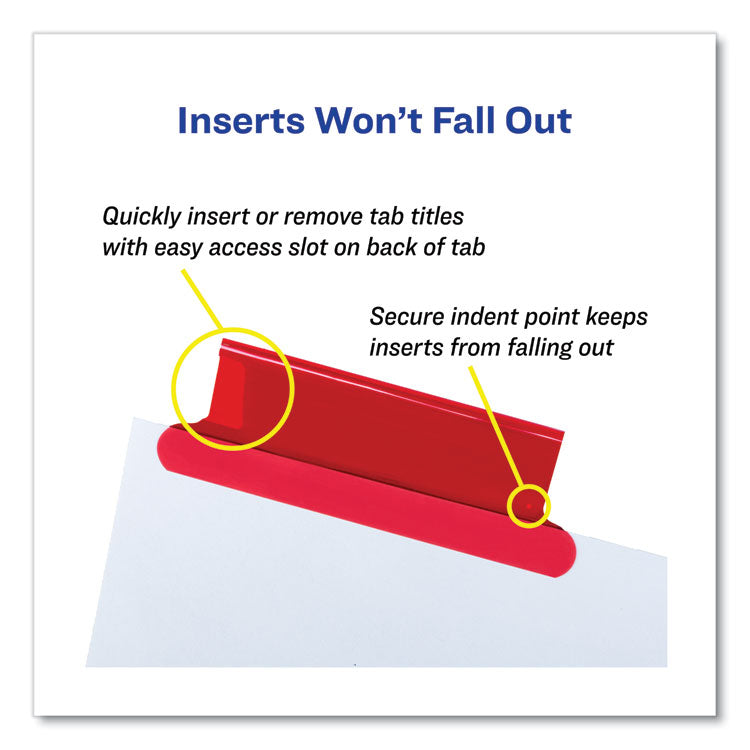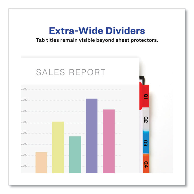 Big Tab dividers are bigger providing 50% more writing space than standard tabs. Special tab design allows easy insertion and removal, but keeps insert securely in place. Reinforced binding edge. White or buff paper dividers with clear or multicolor insertable tabs. It's easy to customize inserts using free templates from Avery Design & Print. Three-hole punched for use in standard ring binders, mini size 5.5 x 8.5 dividers are seven-hole punched for small binders and organizers, and legal size are 4-hole punched for legal size binders. Handwrite or print inserts on laser and inkjet printers. Big Tab White Paper-Extra-wide dividers extend beyond sheet protectors, single-sided clear reinforced edge. Index Divider Style: Customizable; Index Divider Size: 11.13 x 9.25; Punched/Unpunched: 3-Hole Punched; For Use With: Ring Binders.