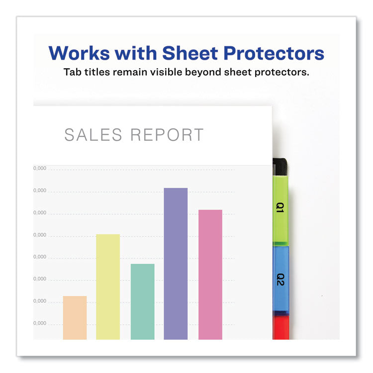 Strong organization and storage capabilities are yours with the help of these Big Tab Two-Pocket Insertable Plastic Dividers. Each divider features double plastic pockets, one on each side of the divider, to provide extra storage space for your important papers. The Big Tab design allows you to use larger fonts or more lines of text than on typical inserts for easier reading or more detailed labeling. Use a free template from Avery Design & Print to customize tabs titles onto the included label sheets using your computer and printer. The tabs' unique design keeps inserts from falling out, so your dividers stay securely labeled. Constructed with durable plastic, these dividers offer lasting organization in a big way. Handwrite or print inserts on laser and inkjet printers. Single-Pocket-Front pocket for storage. Index Divider Style: Customizable; Index Divider Size: 11.13 x 9.25; Punched/Unpunched: 3-Hole Punched; For Use With: Ring Binders.