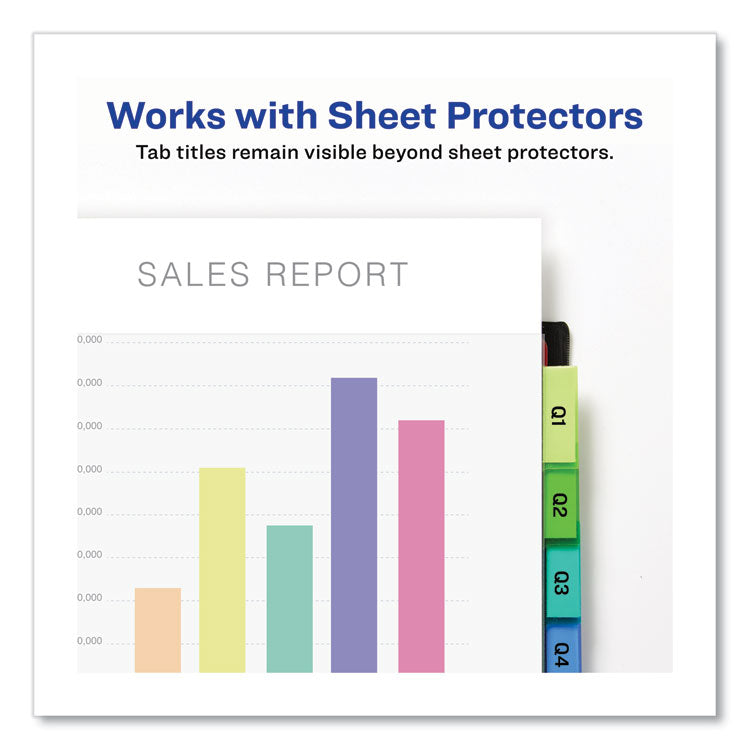 Strong organization and storage capabilities are yours with the help of these Big Tab Two-Pocket Insertable Plastic Dividers. Each divider features double plastic pockets, one on each side of the divider, to provide extra storage space for your important papers. The Big Tab design allows you to use larger fonts or more lines of text than on typical inserts for easier reading or more detailed labeling. Use a free template from Avery Design & Print to customize tabs titles onto the included label sheets using your computer and printer. The tabs' unique design keeps inserts from falling out, so your dividers stay securely labeled. Constructed with durable plastic, these dividers offer lasting organization in a big way. Handwrite or print inserts on laser and inkjet printers. Double-Pocket-Front and back pockets for extra storage. Index Divider Style: Customizable; Index Divider Size: 11.13 x 9.25; Punched/Unpunched: 3-Hole Punched; For Use With: Ring Binders.