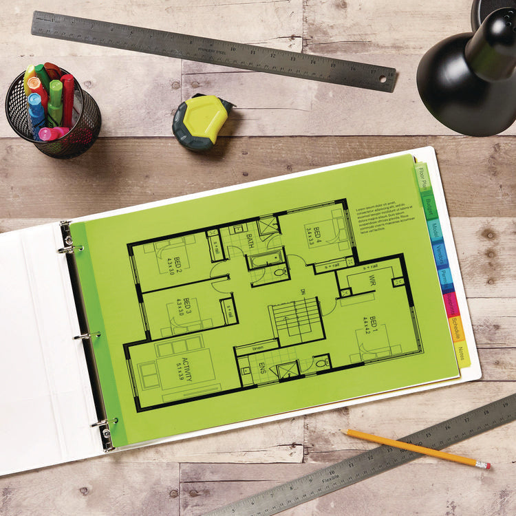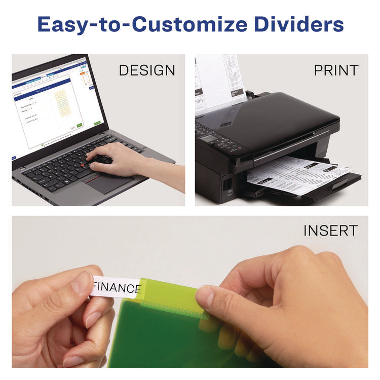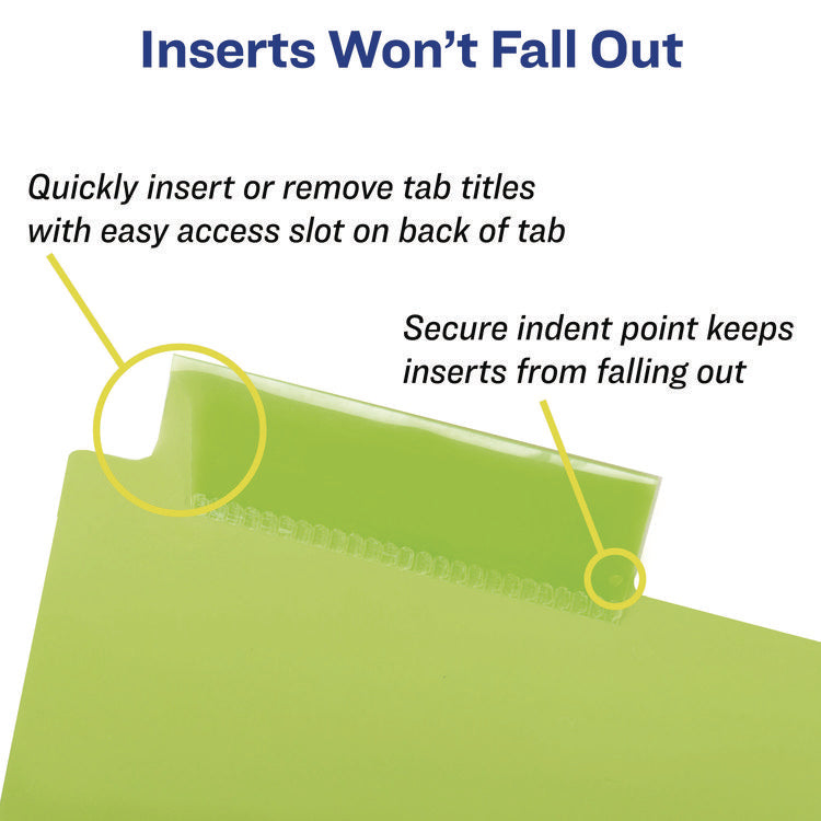 Thinking big? Then these tabloid-size Big Tab™ Insertable Plastic Dividers offer eye-catching multicolor tabs providing 50% more writing space than standard tabs for convenience you can see. The tabs feature a secure indent point that keeps inserts from falling out. Larger tabs allow you to use big fonts or more lines of text for tabs that are informative and easy to read. Create your own professional tabs with templates from Avery Design & Print. Keep your projects organized and in order with larger-than-life dividers. Handwrite or print inserts (compatible with laser and inkjet printers). Index Divider Style: Customizable; Index Divider Size: 11 x 17; Punched/Unpunched: 3-Hole Punched; For Use With: Ring Binders.