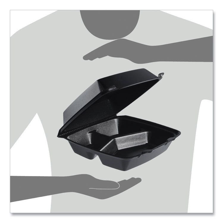 Secure closure improves handling and helps protect against accidental openings. High insulation qualities make them ideal for transporting and storing both hot and cold foods. Carryout service wouldn't be complete without them. Hinged lid containers feature the Performer perforated hinge. This one-of-a-kind feature allows the container's lid to easily be removed, making for a less cluttered dining experience and providing an extra plate for meal sharing. Food Container Type: Takeout Container; Material(s): Extruded Polystyrene; Material Type: Foam; Color(s): Black.