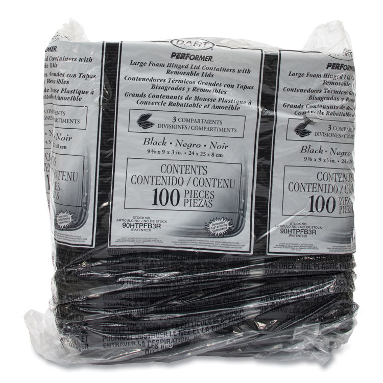 Secure closure improves handling and helps protect against accidental openings. High insulation qualities make them ideal for transporting and storing both hot and cold foods. Carryout service wouldn't be complete without them. Hinged lid containers feature the Performer perforated hinge. This one-of-a-kind feature allows the container's lid to easily be removed, making for a less cluttered dining experience and providing an extra plate for meal sharing. Food Container Type: Hinged Lid Container; Material(s): Extruded Polystyrene; Material Type: Foam; Color(s): Black.