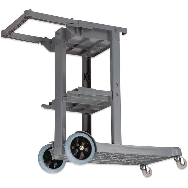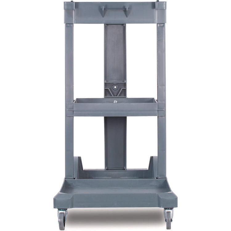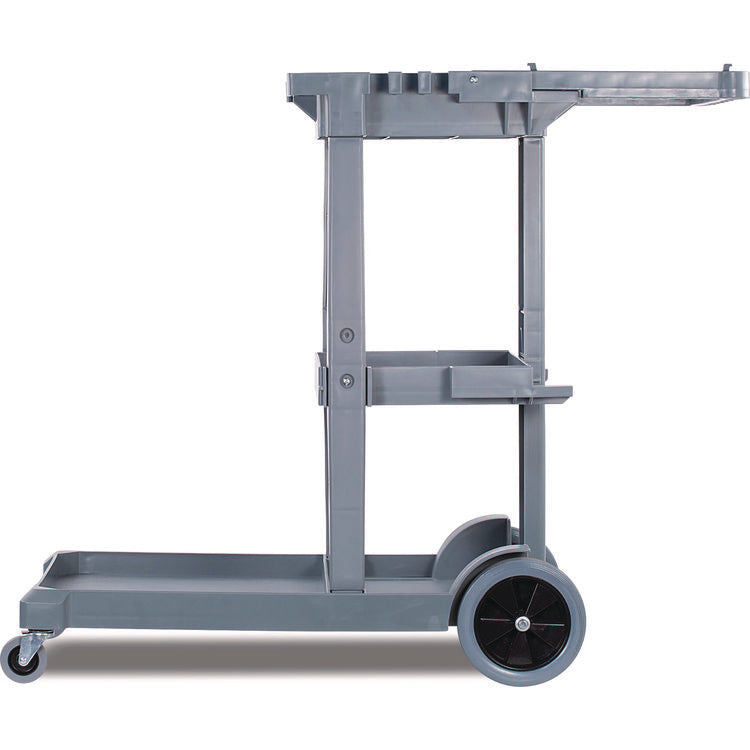 Roomy janitor's cart makes it easy to transport mop buckets, cleaning supplies, restroom stock, housekeeping essentials, and more. Molded-in tool hooks keep mops, brooms, and extension wands upright and ready for use. Durable nylon bag lifts up and is ideal for either waste or linen collection. Nylon bag attaches to hooks along the inside of the janitor's cart for easy installation. Rugged polyethylene can withstand temperatures from -40°F to 180°F and resists cracking, peeling and corrosion for long-term and heavy use. Material(s): Polyethylene (LLDPE); Overall Material Type: Plastic; Color(s): Gray; Color Family: Gray.