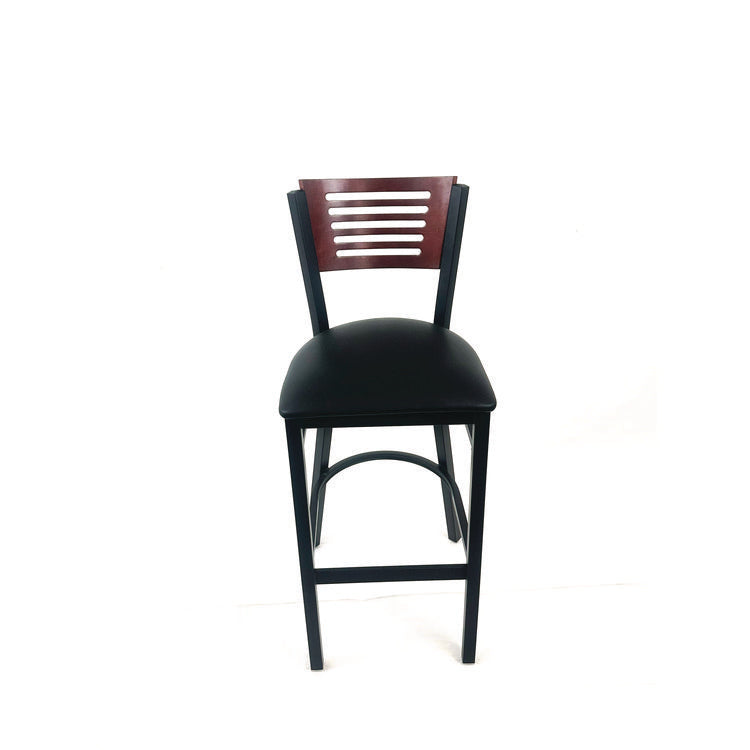 Introducing the perfect seating solution for your home or business-the Jones River Series metal framed barstool with vinyl seat pad. This sleek and modern design is built to provide maximum comfort and durability, all while adding a touch of style to your space. With a sturdy metal frame, this barstool is sure to stand up to even the busiest of environments. The frame is built to last, ensuring that you have a reliable seating option for years to come. The vinyl seat pad is not only comfortable, but also easy to clean and provides a soft and supportive surface that is perfect for extended use making it ideal for high-traffic areas. Whether you're using this barstool in your dining room, kitchen, or bar area, it's sure to impress and is the perfect addition to any indoor space. Recommended Application Area(s): Breakroom & Foodservice; Seat Color: Black; Back Color: Dark Mahogany; Color Family: Black.