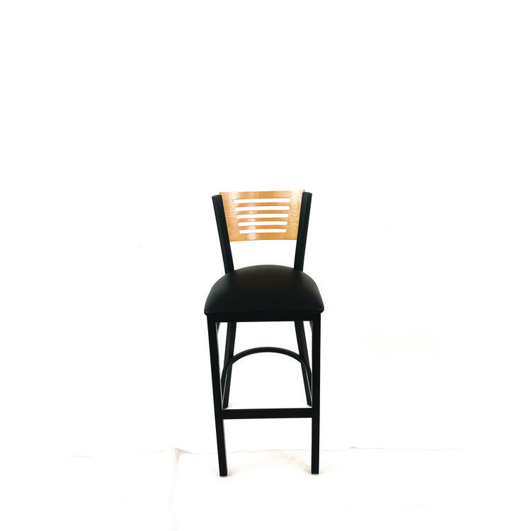 Introducing the perfect seating solution for your home or business-the Jones River Series metal framed barstool with vinyl seat pad. This sleek and modern design is built to provide maximum comfort and durability, all while adding a touch of style to your space. With a sturdy metal frame, this barstool is sure to stand up to even the busiest of environments. The frame is built to last, ensuring that you have a reliable seating option for years to come. The vinyl seat pad is not only comfortable, but also easy to clean and provides a soft and supportive surface that is perfect for extended use making it ideal for high-traffic areas. Whether you're using this barstool in your dining room, kitchen, or bar area, it's sure to impress and is the perfect addition to any indoor space. Recommended Application Area(s): Breakroom & Foodservice; Seat Color: Black; Back Color: Natural; Color Family: Black.
