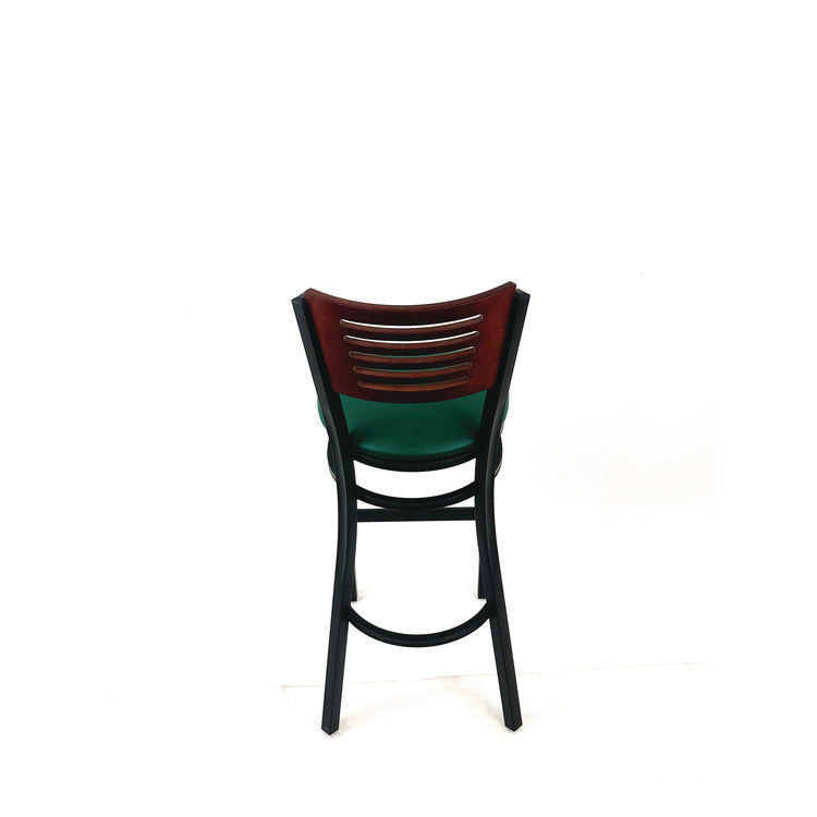Introducing the perfect seating solution for your home or business-the Jones River Series metal framed barstool with vinyl seat pad. This sleek and modern design is built to provide maximum comfort and durability, all while adding a touch of style to your space. With a sturdy metal frame, this barstool is sure to stand up to even the busiest of environments. The frame is built to last, ensuring that you have a reliable seating option for years to come. The vinyl seat pad is not only comfortable, but also easy to clean and provides a soft and supportive surface that is perfect for extended use making it ideal for high-traffic areas. Whether you're using this barstool in your dining room, kitchen, or bar area, it's sure to impress and is the perfect addition to any indoor space. Recommended Application Area(s): Breakroom & Foodservice; Seat Color: Green; Back Color: Dark Mahogany; Color Family: Green.