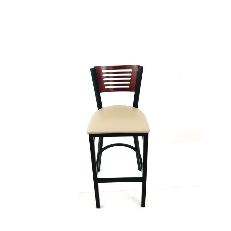 Introducing the perfect seating solution for your home or business-the Jones River Series metal framed barstool with vinyl seat pad. This sleek and modern design is built to provide maximum comfort and durability, all while adding a touch of style to your space. With a sturdy metal frame, this barstool is sure to stand up to even the busiest of environments. The frame is built to last, ensuring that you have a reliable seating option for years to come. The vinyl seat pad is not only comfortable, but also easy to clean and provides a soft and supportive surface that is perfect for extended use making it ideal for high-traffic areas. Whether you're using this barstool in your dining room, kitchen, or bar area, it's sure to impress and is the perfect addition to any indoor space. Recommended Application Area(s): Breakroom & Foodservice; Seat Color: Taupe; Back Color: Dark Mahogany; Color Family: Beige.