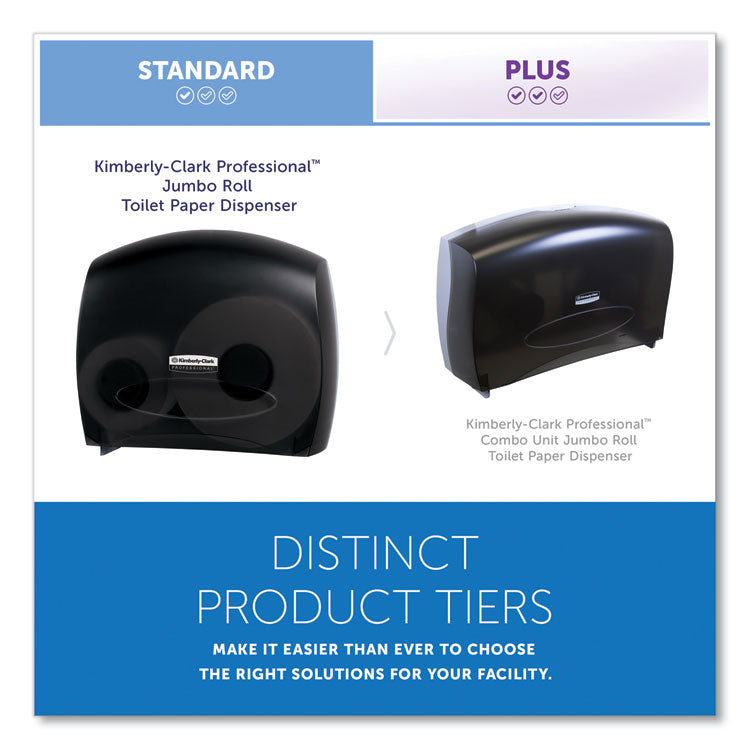 Jumbo bathroom tissue dispenser has a curved design, creating a graceful, contemporary look. Designed for easy access to toilet tissue. Dispenser has a replaceable lock with a push button option, for security and ease of use. Transparent gray plastic easily allows you to see when the paper needs refilling. For Roll Size: 9"; Roll Type: JRT Jr.; Dispenser Capacity (text): Holds One JRT Jr. Roll and One Stub Roll; Color(s): Smoke.